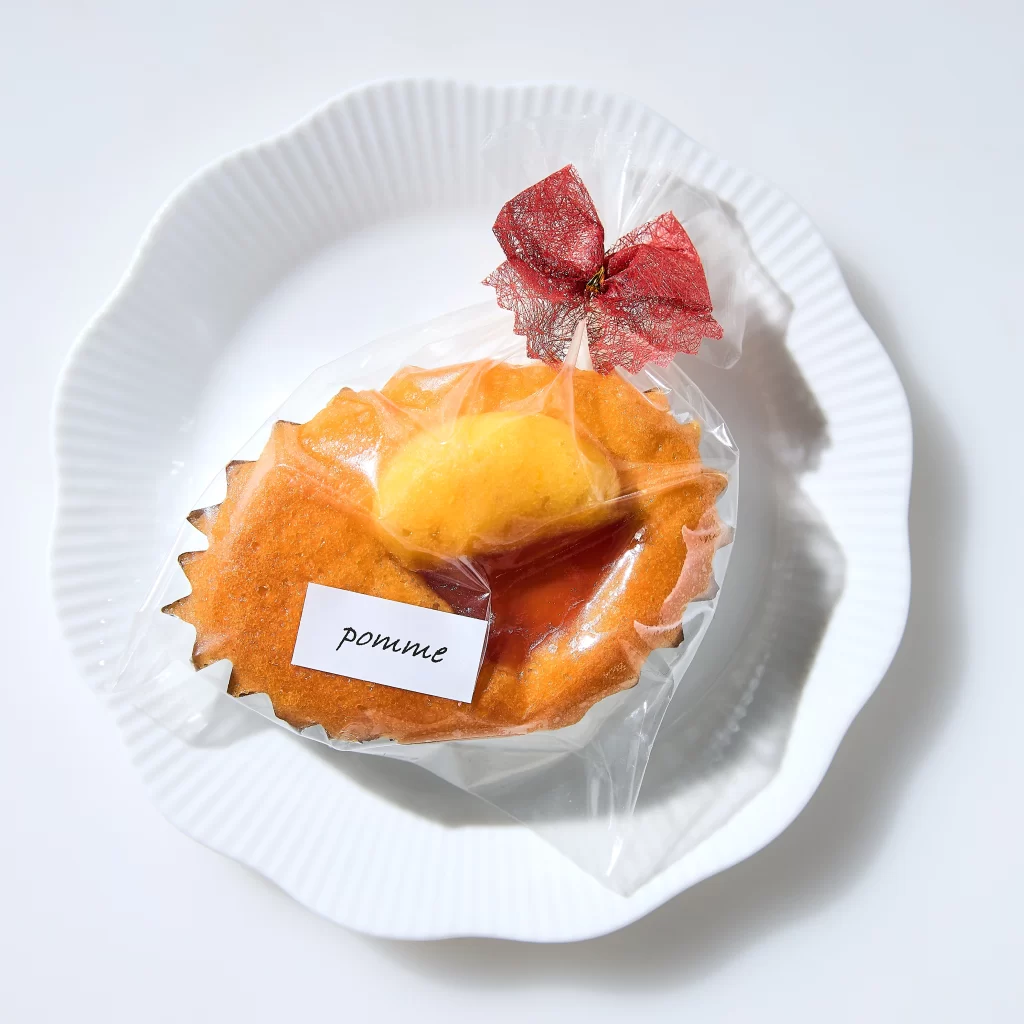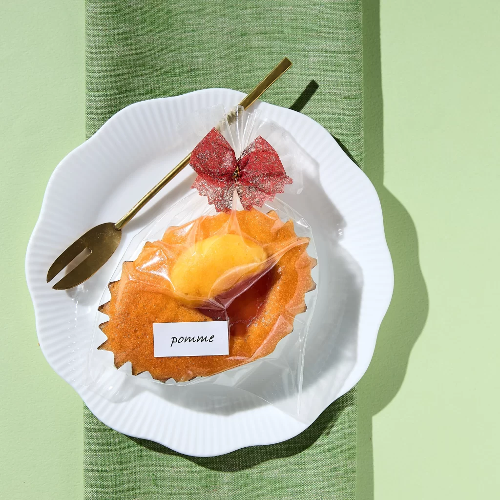 スタジオアイの近くにあるDingDongさんの焼き菓子を撮影してみましょう。お菓子は個包装につつまれていることが多いと思いますが、袋から出してもそのままでもOKです。今回は、個包装がかわいいデザインだったので、お店で買ってきたそのままの状態で使用してみます。リボンと、英字のシールがかわいいですね。